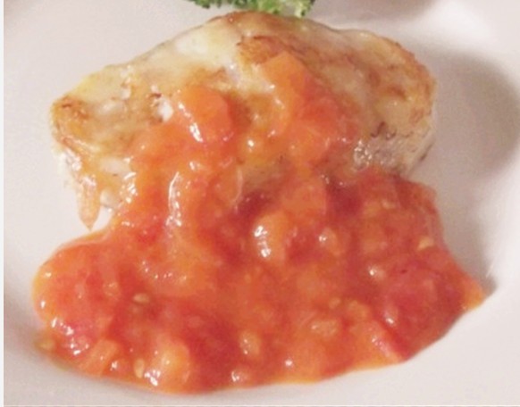 7、铲起番茄酱铺在鳕鱼上面即可。