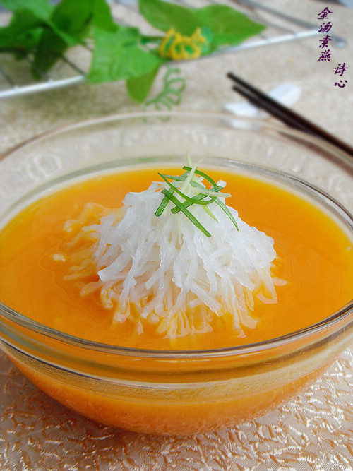 金汤素燕—经过先蒸后煮两道工序,先蒸是为了把白萝卜做出燕窝的口感,(故称为素燕),通过再煮,把骨汤的鲜美、南瓜的香醇、素燕的嫩滑融为一体。具有颜色艳丽、口感爽滑、味道鲜美、营养丰富的特点。