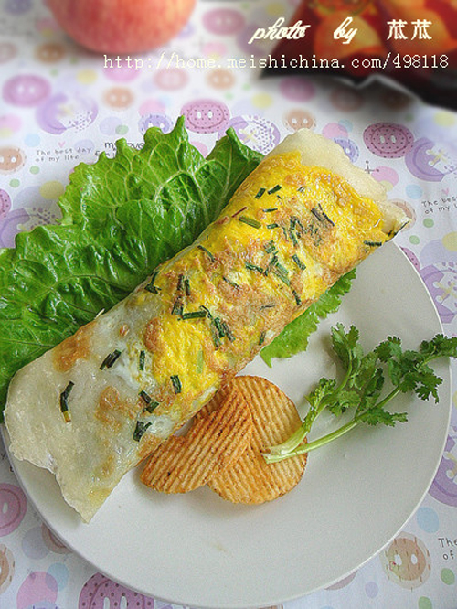 及以下步骤:然后用筷子划开,撒上香葱。(鸡蛋划的时候要轻点) 鸡蛋煎至7.8熟的时候翻面。 然后均匀地抹上烤肉酱,榨菜,薯片,香菜。(不喜欢吃香菜的童鞋,可以不放,多加榨菜。因为薯片是辣的我就没再加辣酱了) 卷起来就可以吃了。香喷喷哇~ 这是我第一次做的,简单,卫生,又实惠呢!动手来做做吧~ 然后用筷子划开,撒上香葱。(鸡蛋划的时候要轻点) 鸡蛋煎至7.8熟的时候翻面。 然后均匀地抹上烤肉酱,榨菜,薯片,香菜。(不喜欢吃香菜的童鞋,可以不放,多加榨菜。因为薯片是辣的我就没再加辣酱了) 卷起来就可以吃了。香喷喷哇~ 这是我第一次做的,简单,卫生,又实惠呢!动手来做做吧~
