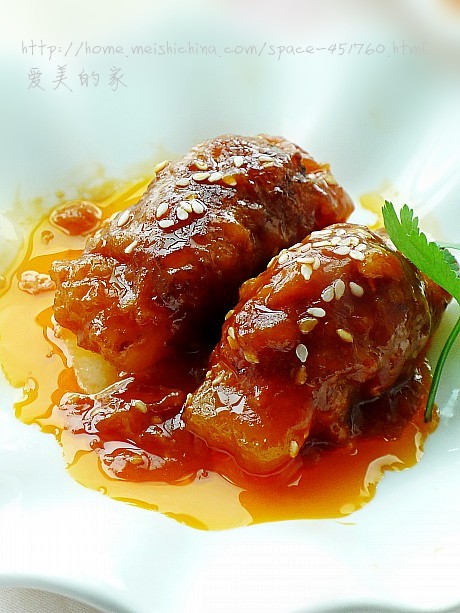 及以下步骤:同方向搅拌均匀后再加入一个鸡蛋继续拌匀。 加入二勺淀粉拌匀。 用盐腌好的萝卜骨洗掉盐分后用吸油纸将表面水分吸干再均匀地沾一层面粉,将萝卜肉泥包在萝卜骨上,用手捏紧。 依次做好所有的排骨后放入普通面粉中沾上薄薄一层面粉。 锅中倒入适量油,油温7成热时放入排骨炸制成型即可捞出。 锅中留底油先将蒜瓣爆香。 依次放入生抽,番茄酱和白糖,再加一小碗水在锅中拌匀煮开。 将炸好的排骨倒入用中小火炖一会儿。 待炖到汤汁浓稠快要收干时撒上白芝麻即可出锅。 待炖到汤汁浓稠快要收干时撒上白芝麻即可出锅。