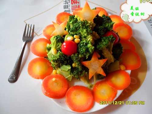 及以下步骤:放入西兰花,盐继续翻炒 加点香油、鸡精出锅 加入两粒圣女果、玉米粒、圣诞小星星来摆一个圣诞树的造型 绰好的西兰花捞出过凉水备用 胡萝卜洗净、切片 取其中三两片用小刀刻出圣诞小星星 锅内放油烧热,放入胡萝卜煸炒一分钟 放入西兰花,盐继续翻炒 加点香油、鸡精出锅 加入两粒圣女果、玉米粒、圣诞小星星来摆一个圣诞树的造型