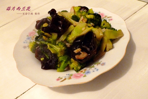 及以下步骤:加蚝油(约一勺量)调味。 加适量的盐,调味。 加入适量的鸡精,大火炒两三分钟,即可出锅。 大蒜6-7瓣,切片,备用。 热锅上油,五成热,煸香蒜片。 倒入西兰花,炒匀。 放入木耳,炒匀。 加蚝油(约一勺量)调味。 加适量的盐,调味。 加入适量的鸡精,大火炒两三分钟,即可出锅。
