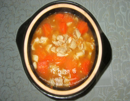 及以下步骤:炒好的羊肉放入砂锅中,倒入煮羊肉的汤。 加入胡萝卜块,煮10分钟。 加入西红柿洋葱酱和适量盐,再煮10分钟即可。 锅烧热,放少许色拉油烧热,倒入西红柿洋葱泥炒熟即可。 鲜羊肉切小块,洗净,用清水泡一段时间,泡出血水。(我大约泡了3个小时) 泡好的羊肉洗干净,放入高压锅中,加清水,水和肉的比例为3:1。大火烧开,去沫,盖上盖,顶气压20分钟。关火,放在阴凉处,温度越低越好,让浮在上面的一层油凝结。去掉凝结的白油,剩下的汤就很清淡不油腻。 炒锅烧热,加少许油,下葱段和姜片炒出香味。捞出羊肉,倒入炒锅中翻炒,加少许料酒,炒至羊肉变色。 炒好的羊肉放入砂锅中,倒入煮羊肉的汤。 加入胡萝卜块,煮10分钟。 加入西红柿洋葱酱和适量盐,再煮10分钟即可。