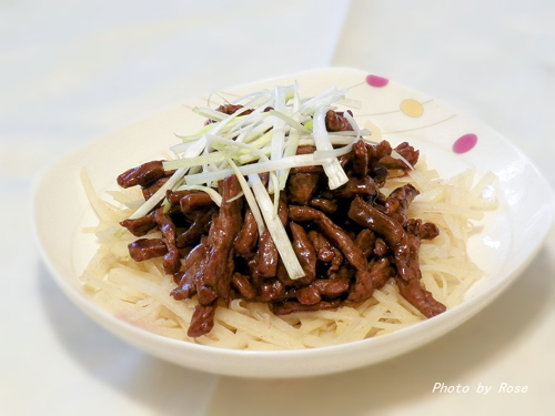牛肉配土豆,就好象郎才女貌,佳偶天成,放土豆丝在牛肉下面,不白白浪费碗汁,让汁流入土豆丝里,土豆丝吸入牛肉汁,更加好味,相得益彰。
