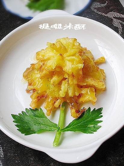 及以下步骤:卷起,并对形状做调整。 锅里放油,油量要够多。热至四五成时把卷好的冬瓜片放入炸至定型。捞出。 升高油温,再次入锅,炸至金黄,捞出控干余油。 橙子去皮,压榨成橙汁。放入小锅中小火加温。 加一勺白砂糖,搅拌均匀。 取少量淀粉兑极少量水化成水淀粉,倒入加过白糖的橙汁中。 搅拌均匀,煮开。炸好的冬瓜菊入盘摆好,淋上橙汁。 取芹菜叶做装饰即成。 搅拌均匀,煮开。炸好的冬瓜菊入盘摆好,淋上橙汁。 取芹菜叶做装饰即成。
