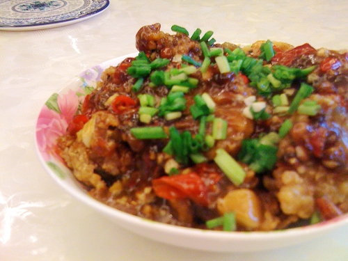 3、余油里下姜、蒜末、泡辣椒炒香至油呈红色时,烹入芡汁、葱花,待收汁淋入香油,起锅浇在前饼上即成。