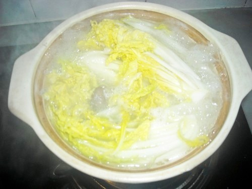 6、打开锅盖放入切好的娃娃菜烫熟,调味、洒些鸡精即可出台了。