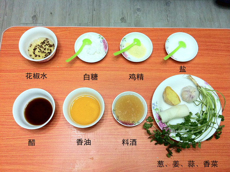 料酒(适量) / 盐(适量) / 葱(适量) / 姜(适量) / 白糖(适量) / 鸡精(适量) / 香油(适量) / 香醋(适量) / 蒜(适量) / 淀粉(适量) / 香菜(适量) / 花椒水(适量)