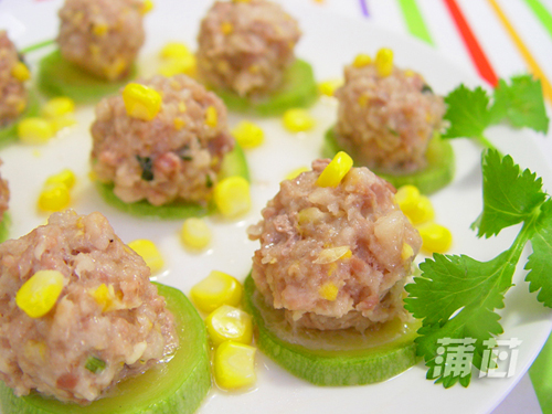 及以下步骤:猪绞肉置入大碗内,加入1/3汤匙盐、1/3汤匙鸡粉、1/2汤匙白糖、1/3汤匙料酒、2汤匙生粉、1汤匙酱油、1只鸡蛋清和3汤匙清水拌匀,顺一个方向打至起胶。 再加入1/3汤匙香油、1/2汤匙葱花和1/2汤匙香菜末拌匀,顺一个方向打至起胶。 猪绞肉置入大碗内,加入1/3汤匙盐、1/3汤匙鸡粉、1/2汤匙白糖、1/3汤匙料酒、2汤匙生粉、1汤匙酱油、1只鸡蛋清和3汤匙清水拌匀,顺一个方向打至起胶。 再加入1/3汤匙香油、1/2汤匙葱花和1/2汤匙香菜末拌匀,顺一个方向打至起胶。 猪绞肉置入大碗内,加入1/3汤匙盐、1/3汤匙鸡粉、1/2汤匙白糖、1/3汤匙料酒、2汤匙生粉、1汤匙酱油、1只鸡蛋清和3汤匙清水拌匀,顺一个方向打至起胶。 再加入1/3汤匙香油、1/2汤匙葱花和1/2汤匙香菜末拌匀,顺一个方向打至起胶。 切碎玉米粒,倒入猪绞肉中拌匀,顺一个方向打至起胶,静置30分钟腌入味。 云南小瓜去头尾洗净,切成0.5厘米厚的片,排放至碟中待用。 双手抹油,抓取适量猪绞肉,挤成鸡蛋大小的丸状,置于碟中的云南小瓜片上,每个丸子各放1粒玉米作点缀。 烧开锅内的水,放入猪肉丸子以大火隔水清蒸15分钟,即可出锅。