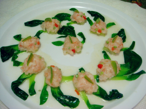 及以下步骤:将准备好的勾芡料(盐,鸡精,生粉)放入炒锅烧开。 芡汁淋在蒸好的鱼儿身上就完成这道菜了。此菜特点:虾膏爽口,青菜清甜。 1)买回来的虾去皮去肠子。然后用厨房纸吸干水份。 上海青用水泡洗干净。 将虾仁用刀背压扁成虾膏,然后放少许盐,鸡精和胡椒粉搅拌均匀。 将清洗干净的上海青取一叶做小金鱼的身,另取一叶一分为二做小金鱼的鱼翅。 然后用小勺将虾膏铺在上海青菜梗上成小金鱼。 最后用红彩椒做鱼儿的嘴,雪豆做鱼儿的背,雪豆仁做鱼儿的眼睛。上蒸锅蒸十分钟即可。 将准备好的勾芡料(盐,鸡精,生粉)放入炒锅烧开。 芡汁淋在蒸好的鱼儿身上就完成这道菜了。此菜特点:虾膏爽口,青菜清甜。