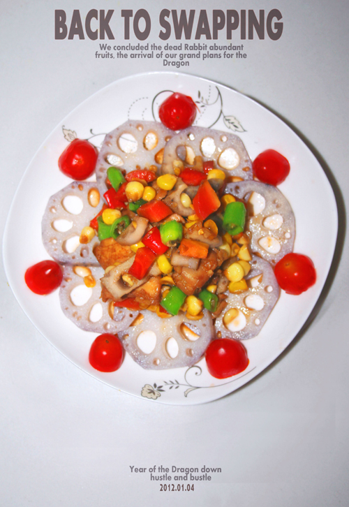 及以下步骤:加入鸡块,等变色,加入一勺鸡精,咸盐,料酒,二十三香,番茄酱,冰糖一小把。 把泡好的花椒水倒入炖的鸡肉里,没过鸡肉即可,开小火开始炖。 炖到水剩下原来的二分之一时。 加入胡萝卜,玉米,莲藕。翻炒。加入一勺生抽上色。 快收汁时加入小米椒和尖椒。收汁即可,鸡肉就炒好了。 把刚才没有切碎煮熟的莲藕装盘。 回龙转凤做好了 ,吃起来莲藕口感香脆可口,鸡肉肉质熟烂,加上玉米,胡萝卜的味道,菜得口感很好。 成品图。 成品图。 成品图。