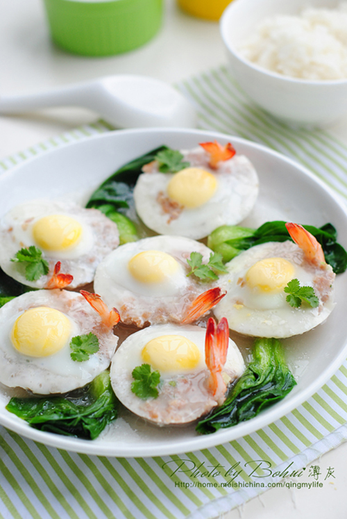 及以下步骤:放入蒸笼内。 大火上汽后转中火蒸约12分钟左右至熟,然后用勺子沿碗壁挖出后摆放盘中,用香菜叶装饰一下。 高汤加水淀粉勾薄芡,淋少许香油。 开水中加少许盐、油,将上海青烫熟摆盘,最后浇上薄芡汤汁即可。 铺上猪肉馅,中间用手指按一个小凹印。 打上鹌鹑蛋,蛋黄位于凹印内,再撒上火腿末。 放入蒸笼内。 大火上汽后转中火蒸约12分钟左右至熟,然后用勺子沿碗壁挖出后摆放盘中,用香菜叶装饰一下。 高汤加水淀粉勾薄芡,淋少许香油。 开水中加少许盐、油,将上海青烫熟摆盘,最后浇上薄芡汤汁即可。