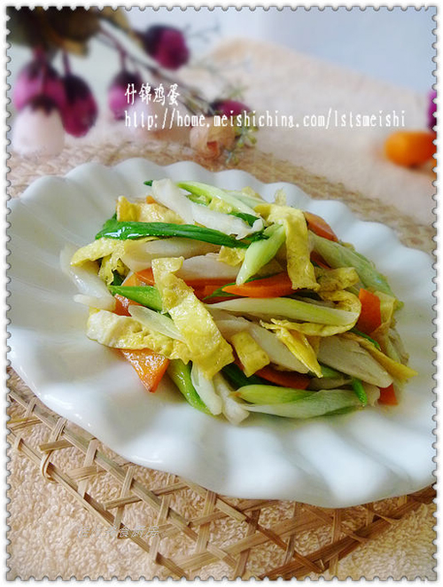 很多的时候,都是很忙碌,都是没有时间做费事的菜,随意看家里有什么菜,集合一下,放个鸡蛋一炒,虽然是很简单,营养基本也够啦,也是我很喜欢也很常吃的菜菜,今天的这个什锦鸡蛋小炒和以往不同,是 用做荷塘小炒剩下的点点藕和胡萝卜,还有做小炒肉剩下的点点青蒜,统一集合炒到一起,鸡蛋我没有炒的,因为炒的鸡蛋油腻,哈哈哈有点怕长肉肉呀,油少才健康吗。所以就用了摊蛋饼的方式把鸡蛋在切成丝,别说随意的搭配成的什锦小炒,没有任何技术含量,加上白白的米饭, 一点蔬菜汤,就是我的一餐了。 虽然年关近了,很多的人都是大鱼大肉和海鲜,可是我还很偏爱这简单的小炒。 这里怡汝版的什锦小炒分享给大家,希望大家喜欢!