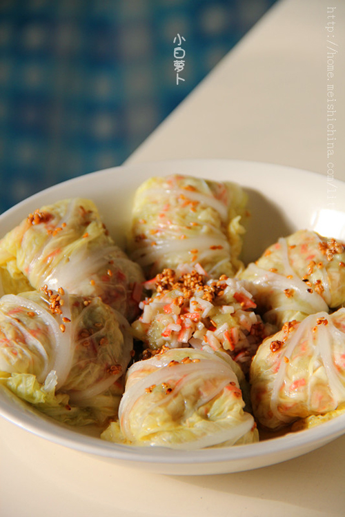 这个菜少油、少盐,可是味道却很多层,最重要的是还省事。此菜又名菜包三克油,因为白菜叶子里包的馅是茄泥和蟹棒泥,合起来是茄蟹泥,是不是和老外说谢谢你很像呢?谢谢你又=thank you(谐音三克油),后来用了少许香油和芝麻炒香淋在白菜包上,成了名副其实的菜包三克油啦。