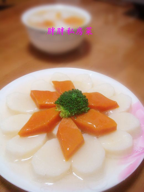 及以下步骤:另起一锅,放入水、盐、味精烧开,用水淀粉勾芡,添加香油即可。把汁浇到山药南瓜上就行了。 先把山药洗净,去皮切成1公分厚的片。 摆入盘中。 先把山药洗净,去皮切成1公分厚的片。 摆入盘中。 南瓜洗净去皮。 切成菱形片。 南瓜摆放到山药上边,摆成六角形状。 放入微波炉中,大火蒸8-10分钟。 另起一锅,放入水、盐、味精烧开,用水淀粉勾芡,添加香油即可。把汁浇到山药南瓜上就行了。