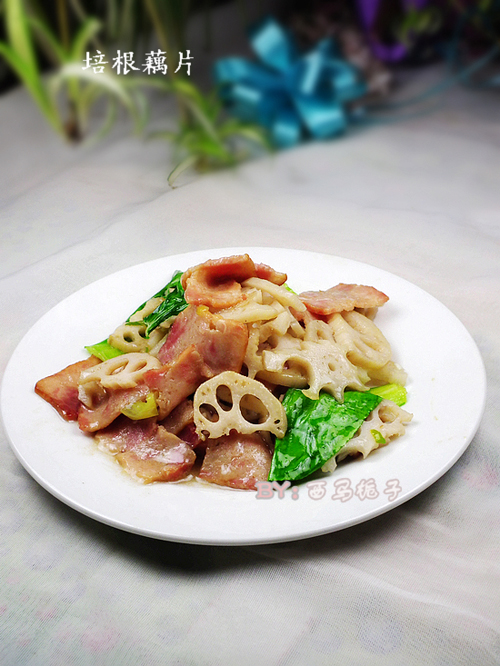 及以下步骤:培根改刀切成小块。 莲藕洗净去皮,切成片。 培根改刀切成小块。 莲藕洗净去皮,切成片。 培根改刀切成小块。 莲藕洗净去皮,切成片。 锅中加入少量的油爆香葱碎,下入配煸炒。 加入藕片继续煸炒1分钟。 加入生抽 盐和少量的水,煸炒至汤汁收干。 加入鸡精调味,撒上油菜叶翻炒均匀即可。