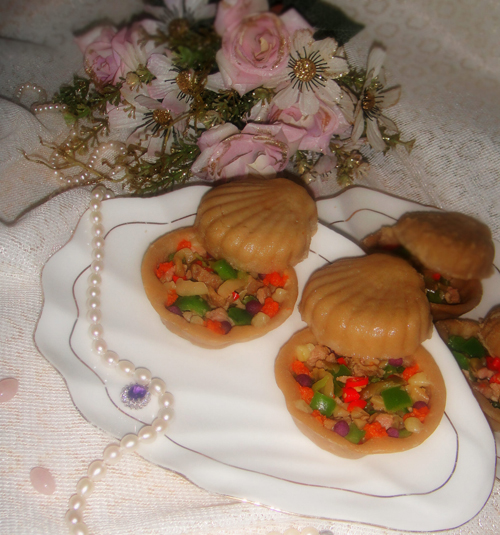 及以下步骤:模具背面抹熟油,左手拿面皮握上玛德琳的模具,右手顶牢。 去除边角余面。 开水下锅蒸3分钟。 待凉后脱模。 上面贝壳制作:将面皮放在抹油模具的里面,压牢,去除余边。 开水下锅蒸3分钟。 待凉后脱模。 准备好馅料的原料,榨菜要脱盐沥干。 将羊肉,青椒切小块,榨菜切丁,小红椒切圈,香葱切碎。 珠光宝气制作完毕,布景拍照。