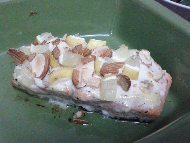 及以下步骤:取三文鱼一块,在上面用到浅浅的划几道 把柠檬的一部分切成丁备用 取三文鱼一块,在上面用到浅浅的划几道 把柠檬的一部分切成丁备用 取三文鱼一块,在上面用到浅浅的划几道 把柠檬的一部分切成丁备用 然后剩下半个柠檬,把汁挤在三文鱼上面,涂抹均匀。 再均匀涂抹盐和胡椒在三文鱼的全身上下,上手就好了,好好按摩一下!胡椒最好要现磨的啊比较香呢~涂好以后就稍微腌制个1小时左右 腌好以后,涂上一层美乃滋,蛋黄酱,名字很多不过其实就是丘比沙拉酱!不要天的那种哦~红色的就可以了。然后摆上柠檬碎,还可以把杏仁也切碎仍在上面。然后就可以进烤箱了。烤箱下层190℃。烤10到15分钟即可。 烤盘太大,显得鱼好小。。。不过一个人吃也可以啦。好好吃哈~