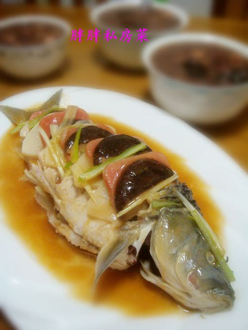 津门蒸鱼--咸鲜口味 津门蒸鱼也叫三夹蒸鱼,因为中间夹上火腿、香菇和冬笋,蒸出来有着火腿、香菇、冬笋和鱼的味道都融为一体了。火腿、香菇的味道好浓香哦~