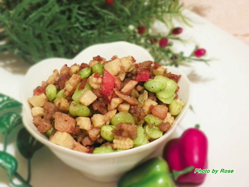 及以下步骤:倒入肉末,喷几下料酒约1茶匙,兜几下,淋入麻油作为明油,稍翻炒,可上碟。 先将萝卜干洗好,用清水泡过,再洗一洗,否则会很咸的,然后切粒,玉米芯切粒、豆豆解冻洗净滤水,辣椒切段。 将肉末放在锅里,中火,将其逼出水,勺去水,加1/4茶匙花椒粉、1/4茶匙胡椒粉、2茶匙生抽、1/4茶匙糖、1茶匙白兰地,搅拌均匀,煸肉末至水基本干,肉末发出香味,盛起备用。 先将萝卜干洗好,用清水泡过,再洗一洗,否则会很咸的,然后切粒,玉米芯切粒、豆豆解冻洗净滤水,辣椒切段。 将肉末放在锅里,中火,将其逼出水,勺去水,加1/4茶匙花椒粉、1/4茶匙胡椒粉、2茶匙生抽、1/4茶匙糖、1茶匙白兰地,搅拌均匀,煸肉末至水基本干,肉末发出香味,盛起备用。 放适量油,放萝卜干和干辣椒1条(切段),煸干水,再爆香,萝卜干要爆过才感特别香。 将利马豆和玉米芯焯水,滤水备用。 起锅,放油,将蒜片和干辣椒1条(切段)爆香。 倒入利马豆、玉米芯和萝卜干,点入精盐1/2茶匙和糖1/4茶匙,稍翻炒。 倒入肉末,喷几下料酒约1茶匙,兜几下,淋入麻油作为明油,稍翻炒,可上碟。
