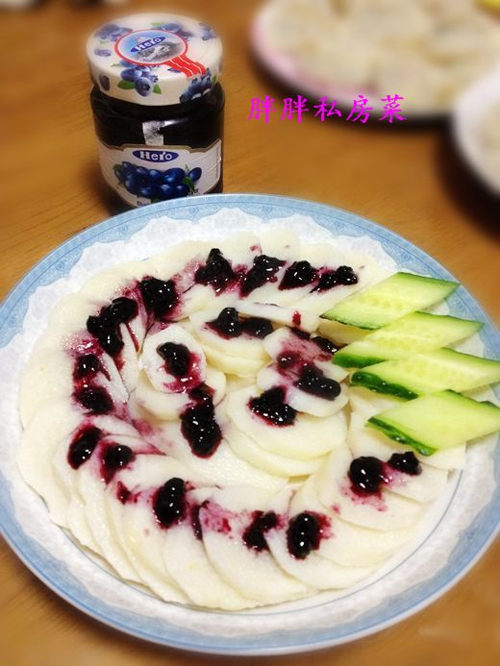 及以下步骤:摆到盘子边上,再把蓝莓酱均匀的撒上即可。 先把山药洗净。 把山药皮刮干净。 先把山药洗净。 把山药皮刮干净。 切成厚薄均匀的片状。 摆到盘子里,摆成圆形。 放到微波炉中,大火蒸6分钟。 再把黄瓜洗净,切成菱形片。 摆到盘子边上,再把蓝莓酱均匀的撒上即可。