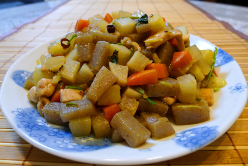 6、最后倒入白萝卜块和土豆块翻炒片刻。