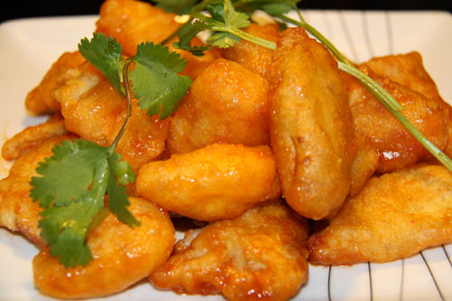 这是一道很爽气的具有西洋风味的东北菜,对它感兴趣最初是因为这个有趣的名字,上网一查原来:哈尔滨建埠之初,清末滨江道府招待西方领事,为了适合西方人喜欢酸甜的习惯,而将鲜咸口的东北焦烧肉片改良而成,取名锅爆肉,没想到此菜深受欢迎,西方人点菜总发不准音,时间一长,衍化成今天的锅包肉。这道菜属中等难度,要点在挂糊和回锅复炸,为了更加方便烹调,我使用了万用炸粉,这样只要炸一次,也没有了调炸粉的麻烦。酸甜酱除了使用番茄沙司以外,还用了多伦多市场随处可见的甜辣酱,口感很好。