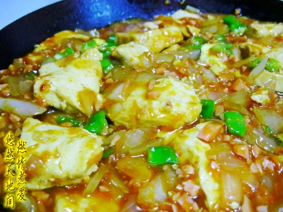 及以下步骤:7、加入事先调好的粉浆翻炒均匀 8、小火炖煮。 9、取平底锅,涂抹少许油烧热,改小火,将事先打好的蛋液摊平。 10、待蛋液底部定型,顶部微熟,倒入炖好的豆腐。 11、关火撒上青椒末。(本人喜欢青椒的清香味,所以放在最后加入。不喜欢的可以提前加入。) 至此,悠然天地间的这道鲜嫩美味的豆腐做好了,享用吧。 9、取平底锅,涂抹少许油烧热,改小火,将事先打好的蛋液摊平。 10、待蛋液底部定型,顶部微熟,倒入炖好的豆腐。 11、关火撒上青椒末。(本人喜欢青椒的清香味,所以放在最后加入。不喜欢的可以提前加入。) 至此,悠然天地间的这道鲜嫩美味的豆腐做好了,享用吧。