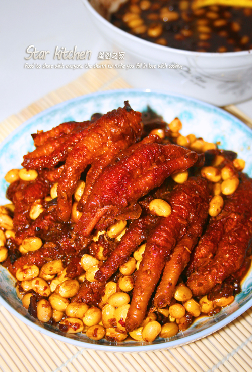 及以下步骤:拿一个空碗,里面放入豆豉一包,加入花椒水,鸡精,料酒,白砂糖5勺子,生抽,老抽,醪糟一勺,调成调料。 弄干的凤爪准备炸制。 炸制凤爪到金黄出锅。 泡好的黄豆和炸好的凤爪。 拿一个空碗,下面放黄豆,上面放炸好的凤爪。 摆好以后倒上事先调好的调料。 上火蒸制,45分钟 ,其中15分钟翻搅一次。 蒸好出锅摆盘。看上去是不是很有食欲。 豆豆的清香,加上蜜汁在凤爪上,味道实在是回味无穷。 看不看这个颜色是不是很有食欲