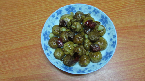 6、锅坐火,注入橄榄油,油热时下蒜块和辣椒段煸炒,见蒜块发黄时,连同辣椒段一同取出待用。