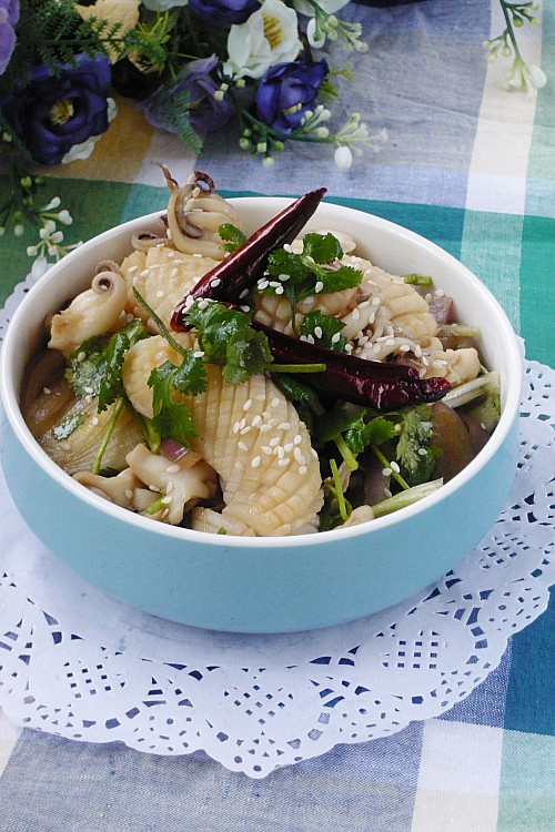 鲜嫩有弹性的鱿鱼,微微带点辣,加上香菜和芝麻的香,开胃又回味!