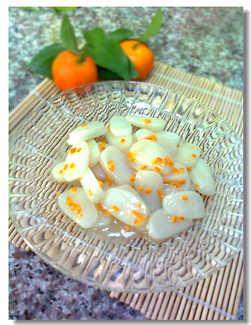 这是家乡年糕的经典做法之一,也是外婆特意向我推荐的烧法,常见于婚庆宴席之上,吃完以后,你会发现蜜里调油说的大概就是这种味道,呵……这里的油一定要用猪油哦,里面可以加橘皮,吃的时候会有怡人的清香。还可以加糖桂花,因为家里没有糖桂花就没加,你如果有,可不要漏下哦。最后,这道美味建议一次少做点,和别人分享,一定要趁热吃,因为,你想啊,又是猪油又是糖的,我不说,你也懂的!