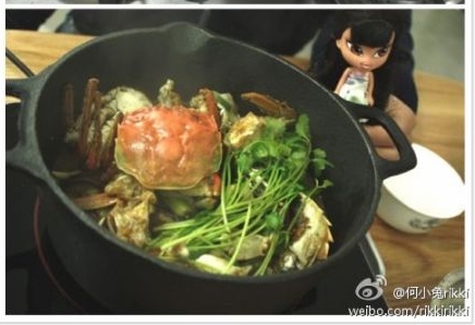 2、接下来是炒大闸蟹,先把油大火烧热,然后关小火,把大闸蟹壳掉后的身子切半,有膏的那一面直接贴着油这么立着放,一分钟左右,膏有点成固体状了,再用锅铲来炒几下,把壳炒得有点红就好,放点酒和耗油、盐。然后倒在刚才下面是年糕的小熊锅上。