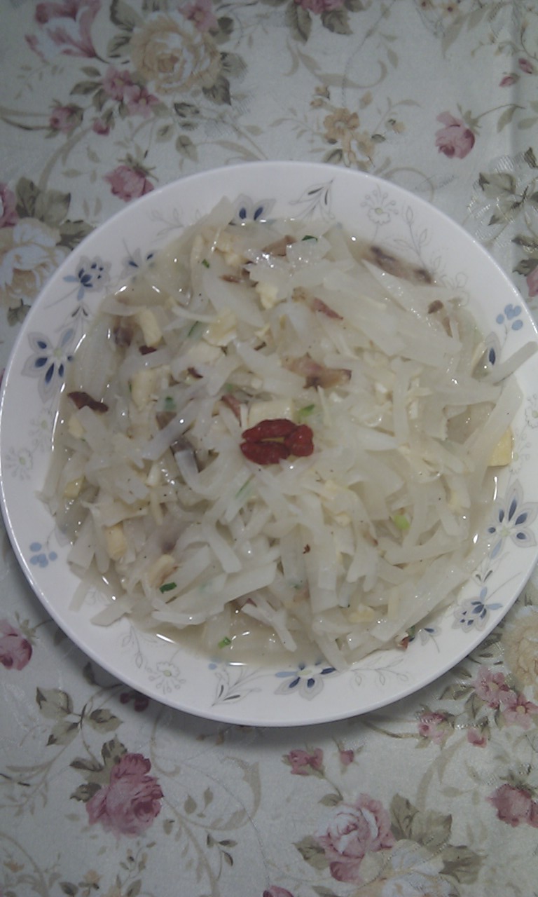 1、萝卜和干贝都弄成丝状,目的是为了食物熟得快点,切片也可以,但是烧的时间更长