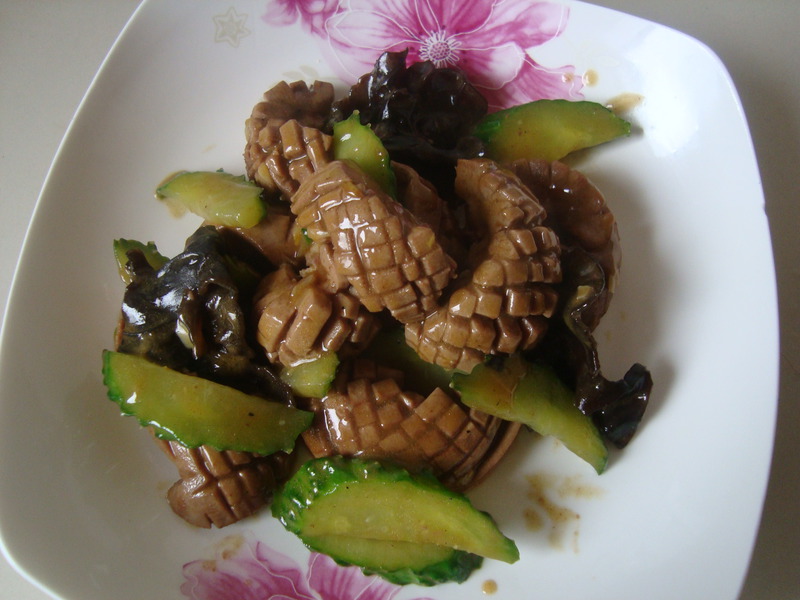 4、再放入木耳及黄瓜片,略炒后烹入高汤(可用水代替)、生抽、淀粉兑成的汁,翻炒几下,待汁裹住腰花后即可出锅。