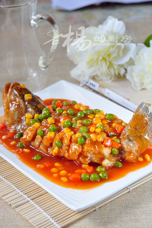 及以下步骤:原料图。青豆玉米胡萝卜焯水一下捞出沥干。 鲈鱼去头,从肚子里去中间脊骨(皮不断。切花刀,用盐,胡椒粉腌渍十分钟入味。 原料图。青豆玉米胡萝卜焯水一下捞出沥干。 鲈鱼去头,从肚子里去中间脊骨(皮不断。切花刀,用盐,胡椒粉腌渍十分钟入味。 原料图。青豆玉米胡萝卜焯水一下捞出沥干。 鲈鱼去头,从肚子里去中间脊骨(皮不断。切花刀,用盐,胡椒粉腌渍十分钟入味。 鲈鱼用厨房纸吸干水分,均匀沾上淀粉,包括花刀的里面,不然就无法张开了。 入油锅大火炸定型,捞出复炸一遍(复炸这一遍最好在汁熬好后做),成金黄酥脆装。 把番茄酱,白砂糖,果醋,半碗水,并青豆玉米胡萝卜一起放入锅里,大火烧开,勾薄芡,至汤汁粘稠即可。 把熬好的汁趁热浇在复炸过的鱼上即可。