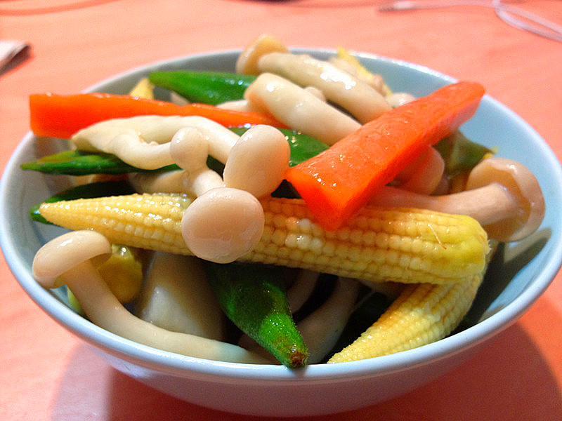 胡萝卜(1根) / 荷兰豆(10个) / 山药(1小段) / 秋葵(5个) / 玉米笋(5个) / 白玉菇(1柄)