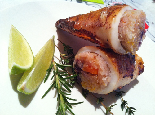本菜品 前半部分是俄罗斯婆罗浮 plof (就是将所有食材加入米饭中一起焖熟) 后半部分为欧洲做法 烤鲜鱿鱼 (盐 胡椒。。)