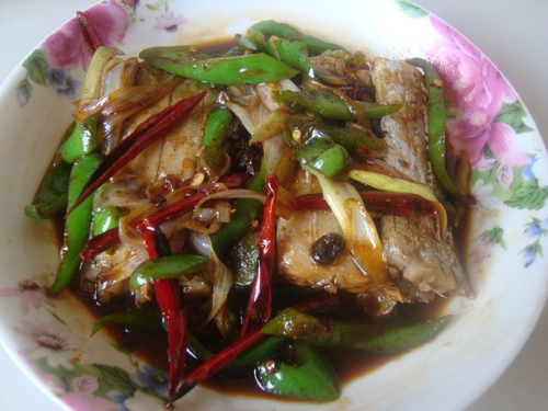 青椒(1个) / 小红椒(3个) / 植物油、胡椒粉(适量) / 料酒、豆豉(适量) / 姜、葱、生抽(适量) / 白糖、鸡精、老抽(少许)