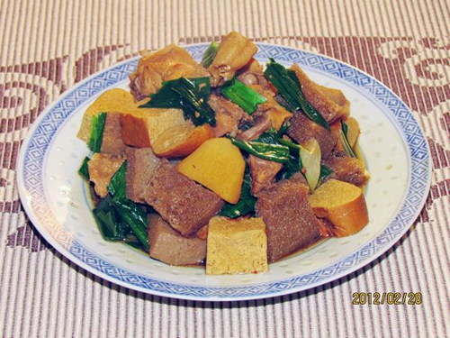 今天做个三杯豆干兔。 兔肉太多,除了豆腐干,再配上魔芋。 没有九层塔,就加些蒜叶。 再加两片白芷和一粒草果。 这么乱,应该不算三杯了,但最后效果很好。