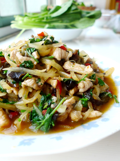 1、猪里脊肉切丝,加1小茶匙生粉、1勺料酒及少许盐,抓匀腌制半小时以上。