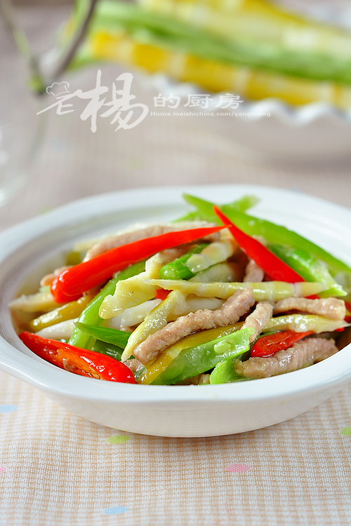 及以下步骤:原料图。 笋,豆角切丝,先把竹笋煮3-5分钟后再下入豆角一起焯熟。捞出过冷水沥干(一定要沥干) 原料图。 笋,豆角切丝,先把竹笋煮3-5分钟后再下入豆角一起焯熟。捞出过冷水沥干(一定要沥干) 原料图。 笋,豆角切丝,先把竹笋煮3-5分钟后再下入豆角一起焯熟。捞出过冷水沥干(一定要沥干) 肉丝提前切丝,用盐,胡椒粉各一茶匙,食用油两茶匙,抓均匀。腌渍十分钟,然后拌一茶匙干淀粉,抓均匀。 五成热油滑散肉丝,肉丝全部变白盛出。 这一步很关键,一定要用能爆炒的锅,平底锅那种是不行的。只有爆炒,这种小菜才好吃。锅里放油,把葱姜辣椒爆炒一下,放入沥干的笋丝豆角丝,大火翻均匀,淋一勺热高汤,放入盐翻炒两下。注意,一定要是热的,冷的是不行的。 放入肉丝翻炒均匀即可。