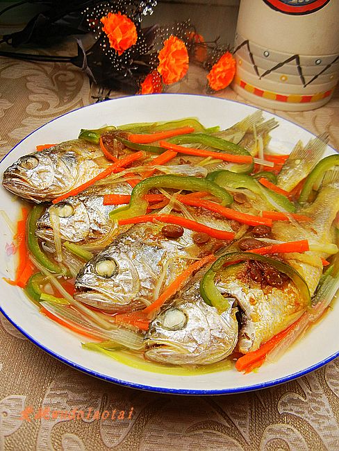 及以下步骤:浇上植物油。 水开后,隔水蒸6分钟。 浇上蒸鱼豉油,蒸1分钟,闷2分钟即可。 黄鱼去鳃,去鳞,去肚洗净,撒盐与姜丝。 撒些豆瓣酱。 浇上料酒。 把胡萝卜,青椒,大葱丝撒在鱼上。 浇上植物油。 水开后,隔水蒸6分钟。 浇上蒸鱼豉油,蒸1分钟,闷2分钟即可。