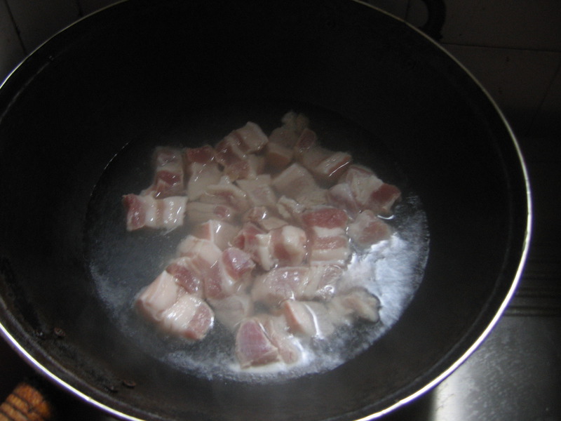 7、热锅冷油,下入五花肉,炒成金黄色后加入糖提亮色后加黄酒和老抽。(详细做法可看我做的秘制红烧肉)加上水漫过肉。