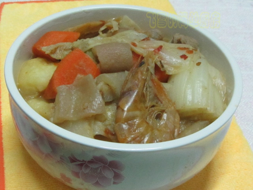 及以下步骤:坐锅热油一勺,先下葱姜和胡萝卜煸炒 高压锅用自来水冲凉打开盖后捞出脊骨和肉皮土豆,加到铁锅里拌炒一下 加入高压锅里的汤汁后,加大白菜和虾干一起煮 煮开后加一勺蒜蓉辣椒酱和少许食盐小煮 加少许生抽拌匀 出锅盛入大碗 加入高压锅里的汤汁后,加大白菜和虾干一起煮 煮开后加一勺蒜蓉辣椒酱和少许食盐小煮 加少许生抽拌匀 出锅盛入大碗