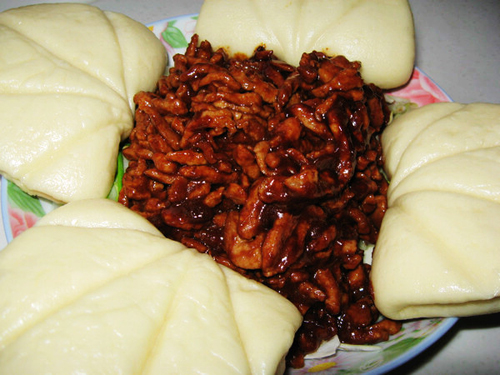 及以下步骤:用刀背压出花纹,我这个忒粗糙了。 放到蒸锅里再次醒发15-20分钟。 开火蒸,大火15分钟,关火焖3分钟,好了。 猪肉切丝,不要太细,加料酒和淀粉抓匀,略腌制一会。 大葱取葱白,切丝,铺在盘子上。 锅中倒少量油,3-4成热时倒入肉丝翻炒。 炒到肉丝变白后盛出备用。 锅中加少量油,倒入酱料小火烧制冒泡。酱料:豆瓣酱1汤匙(不是郫县豆瓣酱)、甜面酱2汤匙、番茄酱1汤匙、蚝油半汤勺、白糖一茶匙,搅拌均匀。 将肉丝倒入翻炒,让每根肉丝都均匀裹上酱料,盛到葱丝上面即可。 将肉丝倒入翻炒,让每根肉丝都均匀裹上酱料,盛到葱丝上面即可。