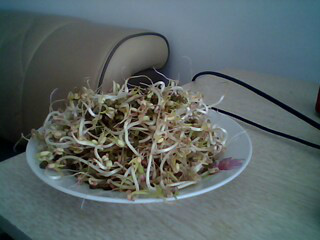 6、哈哈,这就是我发好绿豆芽的样子。由于刚开始没有经验,而且我和儿子总打开看,就伤热了,变红了。