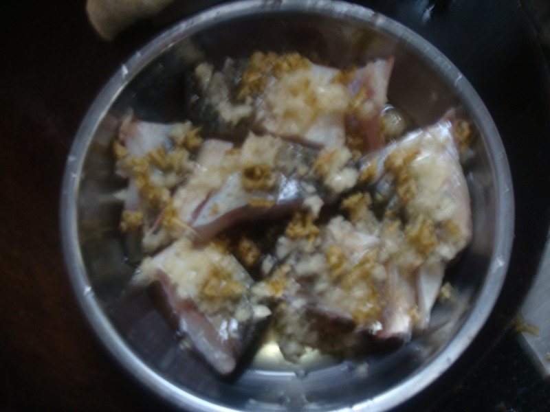 及以下步骤:把鱼的內外涂满食盐 用保鲜袋密封装好 把鱼的內外涂满食盐 用保鲜袋密封装好 把鱼的內外涂满食盐 用保鲜袋密封装好 再用饭盒装满水压在鱼上面8小时后待用 把陈皮一起垛碎 再把它铺在鱼面上蒸 最后加入花生油蒸就完成了