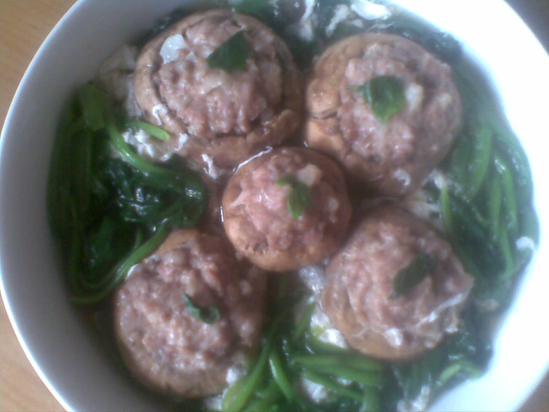 及以下步骤:把口蘑去掉小梗,芯掏空,菠菜用水焯一下。焯的时候水里加盐。 菠菜焯好后捞出放在盆底。 把口蘑去掉小梗,芯掏空,菠菜用水焯一下。焯的时候水里加盐。 菠菜焯好后捞出放在盆底。 把口蘑去掉小梗,芯掏空,菠菜用水焯一下。焯的时候水里加盐。 菠菜焯好后捞出放在盆底。 把口蘑去掉小梗,芯掏空,菠菜用水焯一下。焯的时候水里加盐。 菠菜焯好后捞出放在盆底。 肉馅里加入十三香,像拌饺子馅一样把调料放齐,镶到口蘑里,上锅蒸十分钟。出锅摆在菠菜上。 另起一锅,倒入高汤,把蒸口蘑时出的汤汁也倒进去,把口蘑掏出来的小碎渣都放进去,开锅稍淋一点鸡蛋,浇到摆好的菜上就好了。