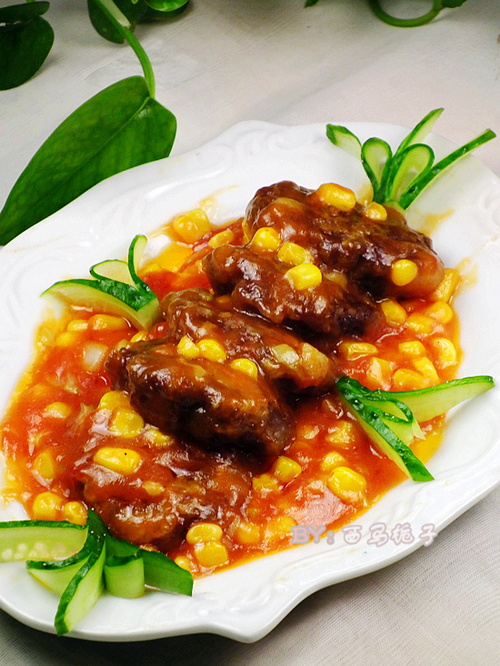 女人天生爱美,喜欢一切美好的东西。喜欢漂亮美味,又有营养的食物。 黄黄的玉米,红亮的汤汁浇在浓香的肉饼上,是不是十分的诱人。玉米茄汁浇肉饼是一款颜色鲜艳味道酸甜爽口的菜肴。玉米的自然香味和酸酸甜甜的茄汁结合起来,浇在浓香的肉饼上,味道非常诱人食欲。玉米所含的营养非常丰富,含有胡萝卜素、维生素b1、维生素b2、烟酸等。并具有延缓细胞衰老和脑功能退化的作用。茄汁富含番茄红素,番茄红素是较强的抗氧化剂,可改善老年性黄斑病变。还具有养颜美容、增进食欲、提高对蛋白质的消化、减少胃胀食积的功效。